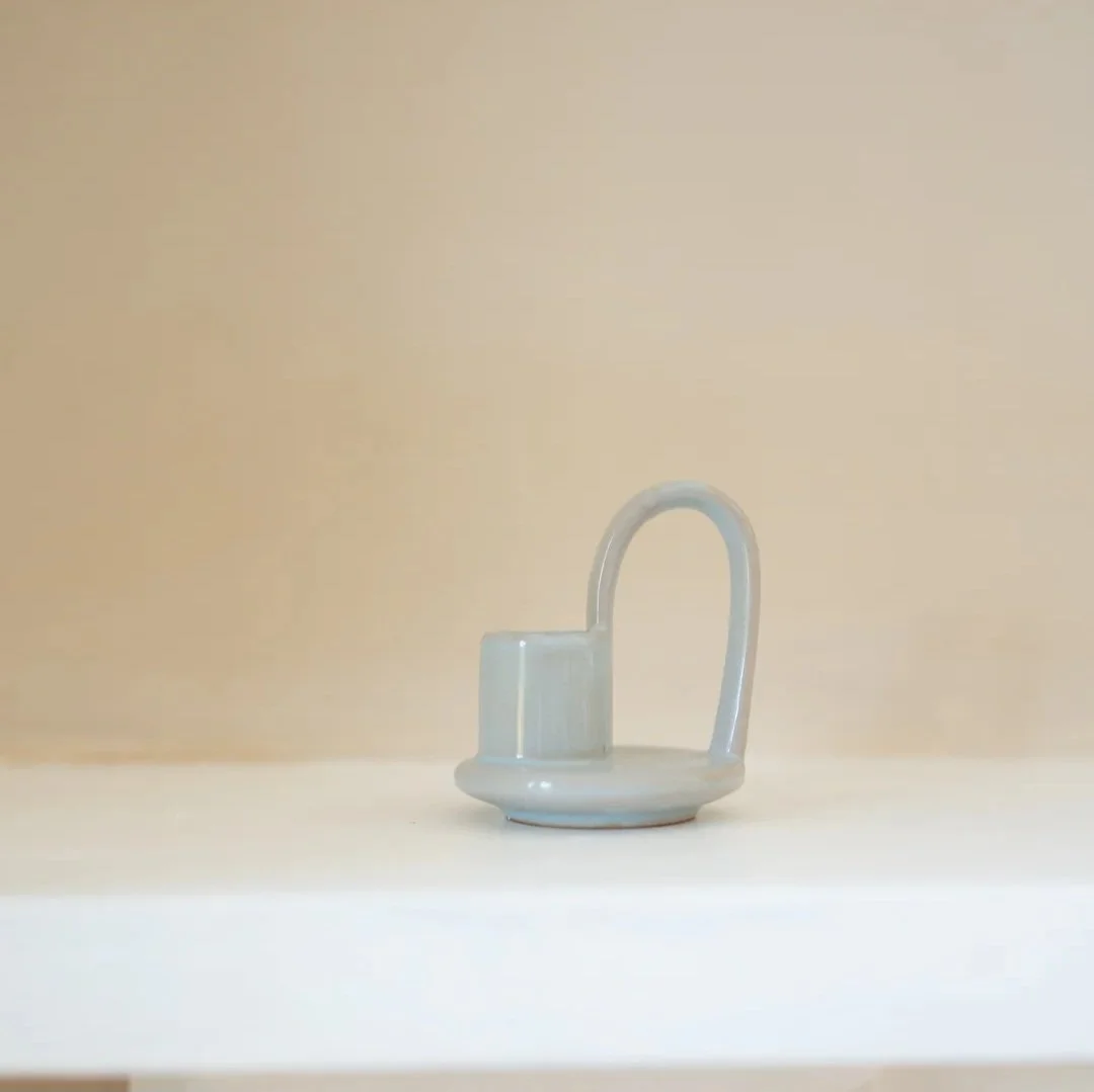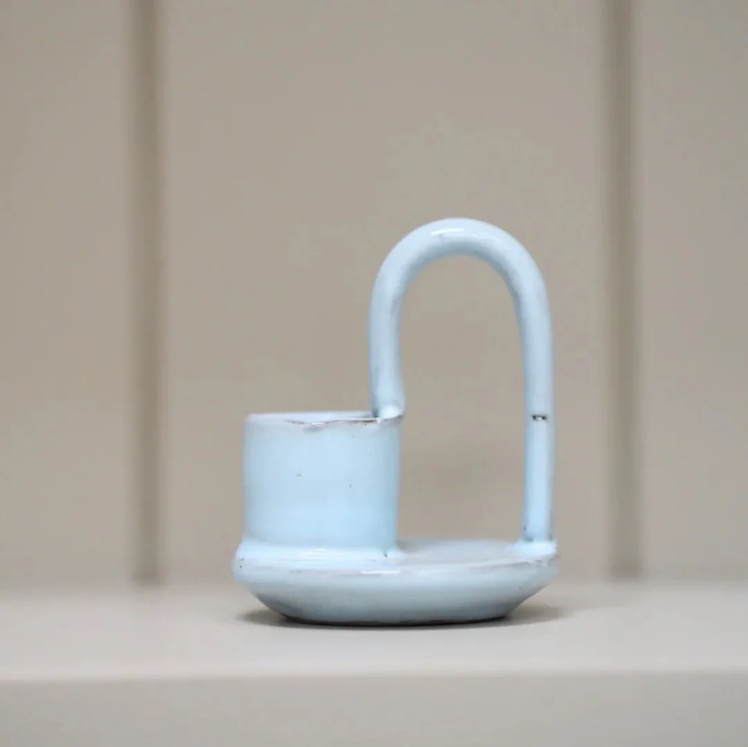Ceramic candle holder with a handle glazed in eggshell blue. This candle holder is a fresh take on a classic design and makes a super cosy addition to any room.